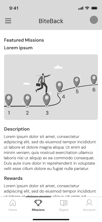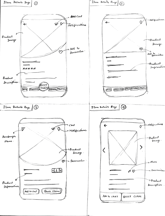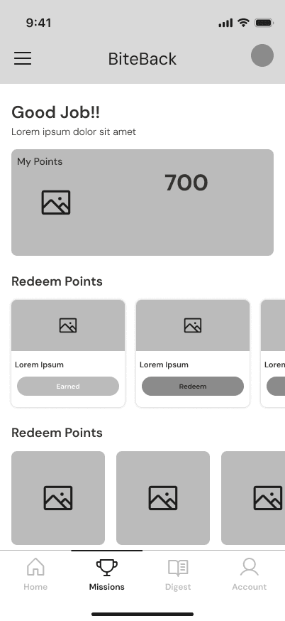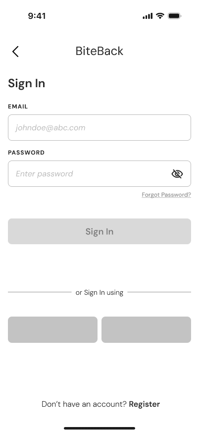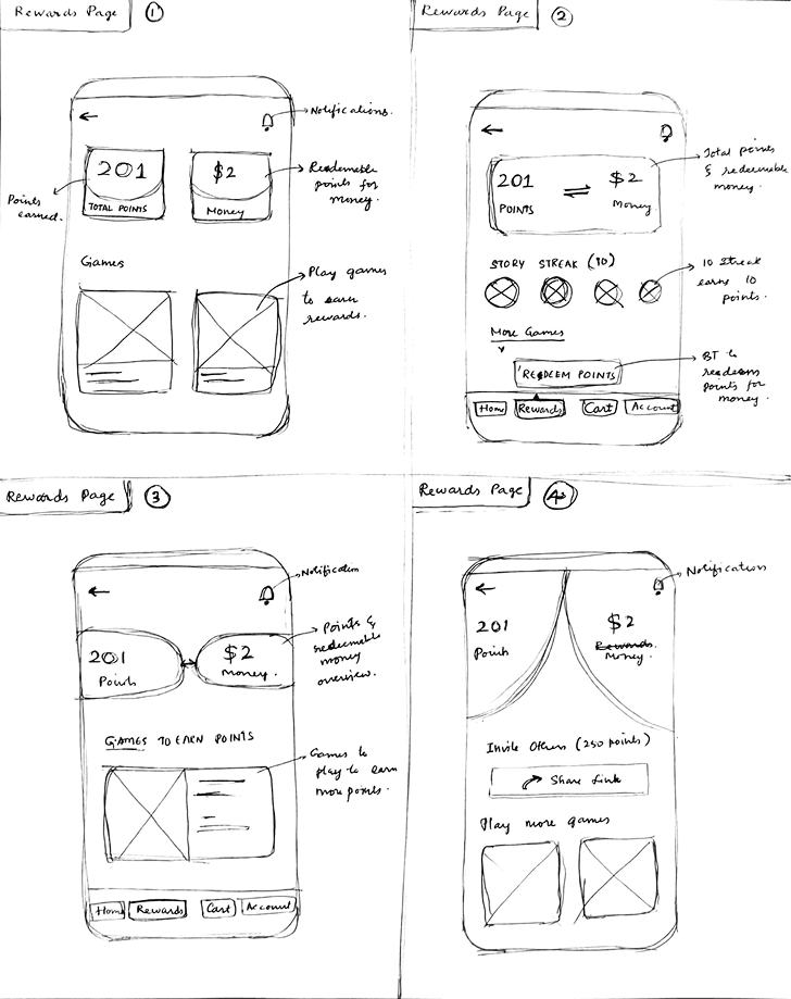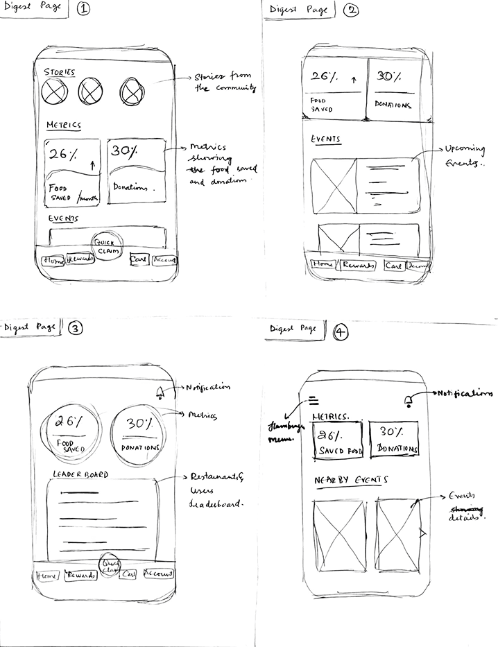 We drafted four sketches for each of BiteBack’s top four screens, exploring different approaches. After review, we refined them down to a single, focused design for each.