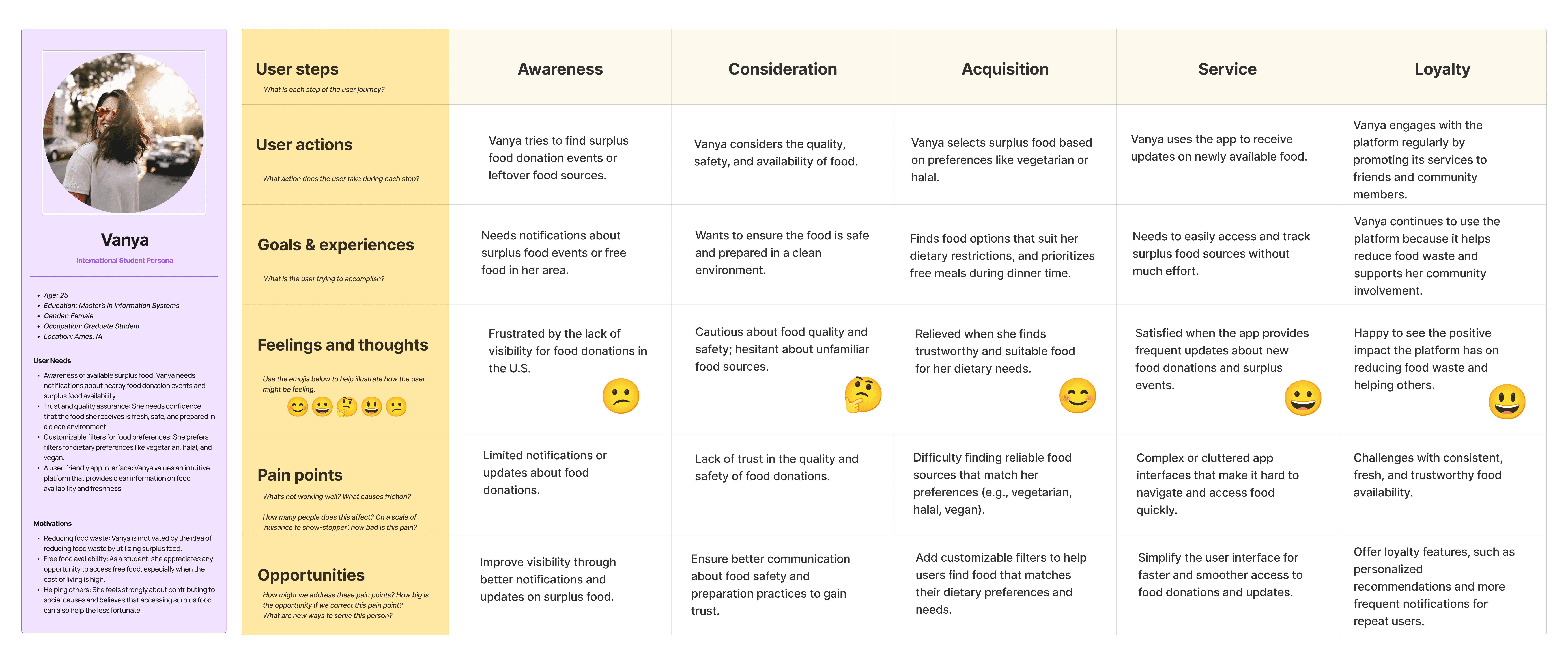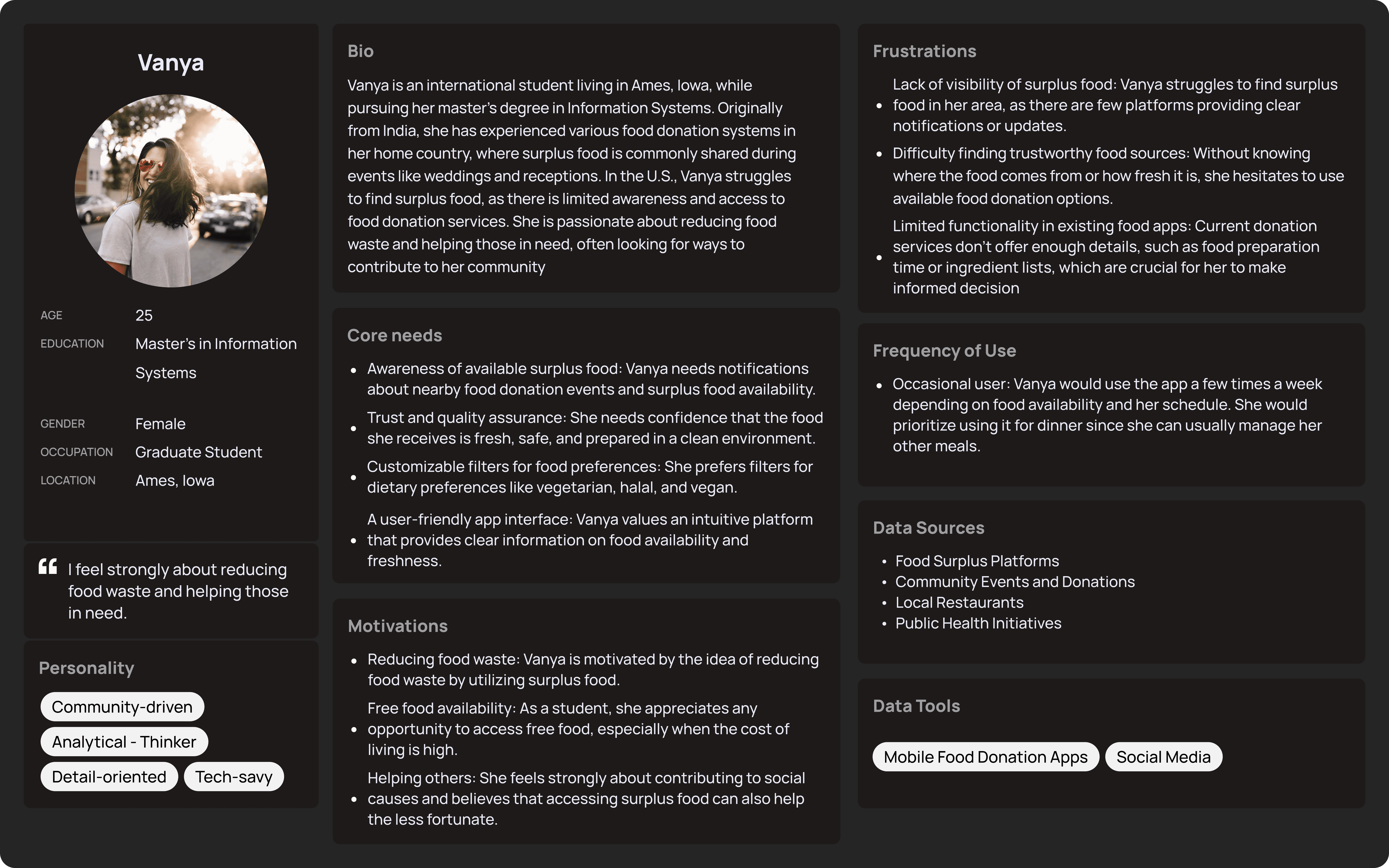 Vanya, a 24-year-old grad student in Ames, Iowa. She’s juggling classes and a tight budget, saying, “I didn’t even know restaurants had leftovers to give!” She needs speed, safety, and a way to feel connected.