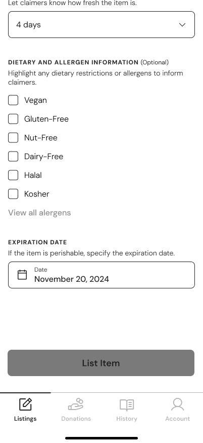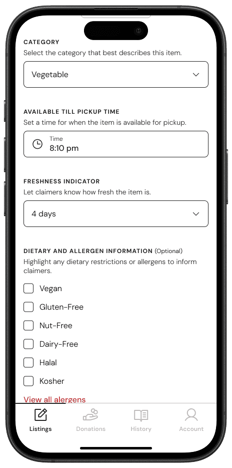 A streamlined, intuitive process for restaurants to list surplus food effortlessly.
