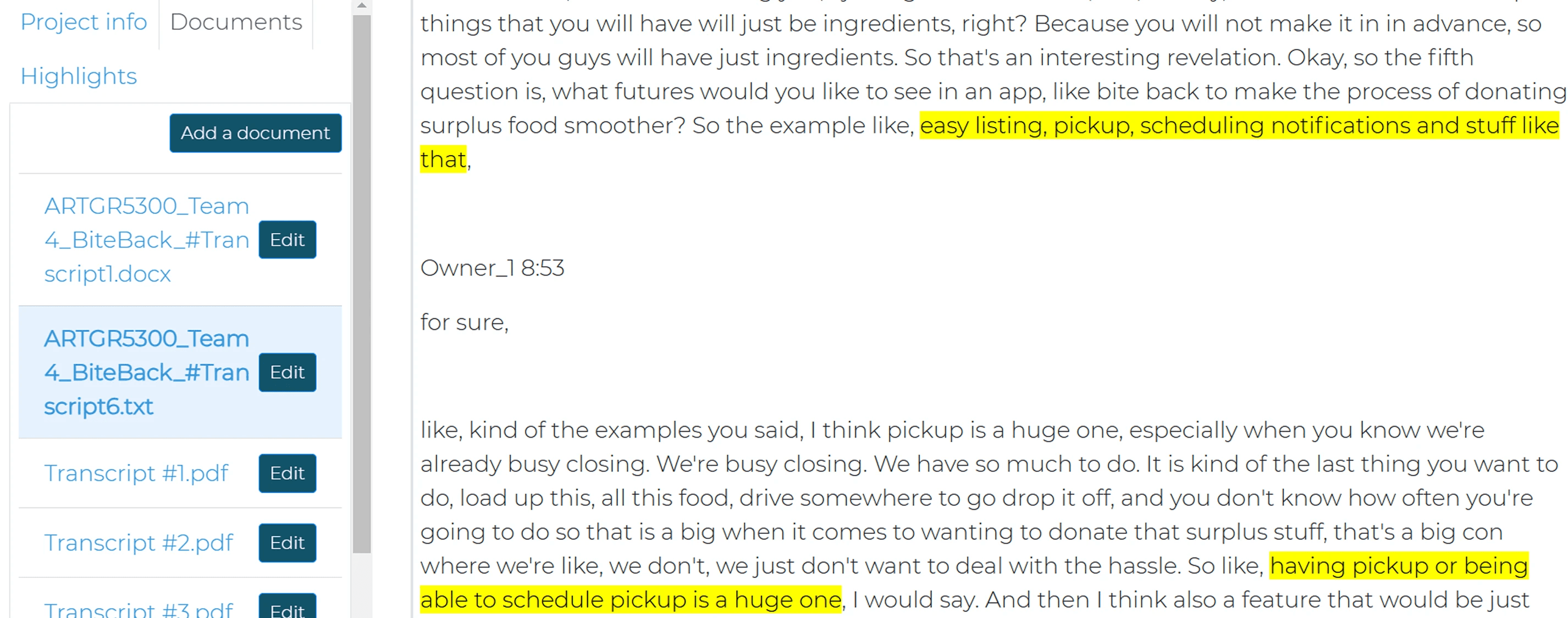 Seven interviews gave us a window into real struggles—students like "User 1" (from the above Taguette screenshot) craving fresh food fast, and restaurant managers dreaming of hassle-free donations.