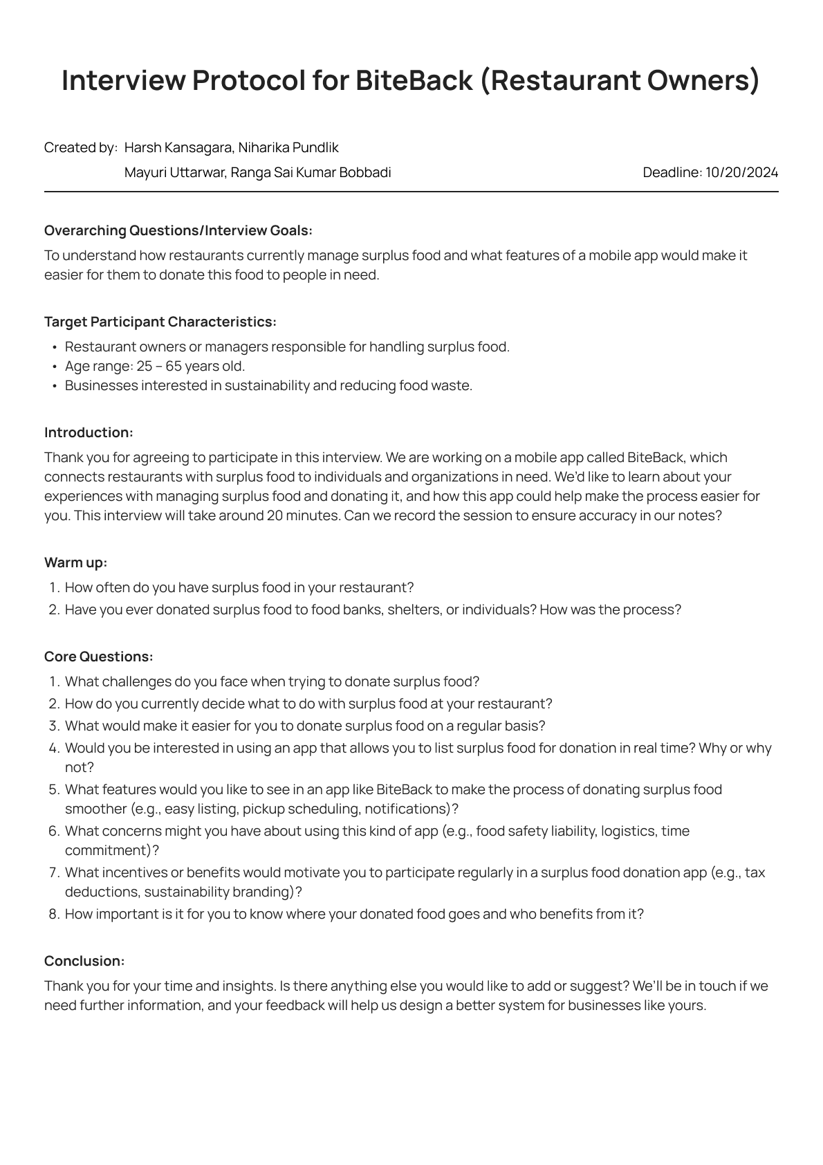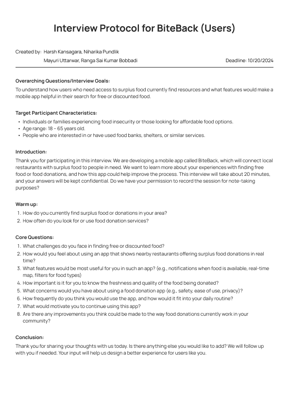 We created two separate protocols for interviewing Users (Individuals claiming food) and Restaurant Owners (Restaurants donating food) while asking additional follow-up questions as and when needed.