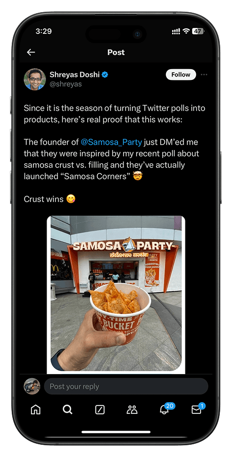 A D2C food brand, Samosa Party, leveraged the poll results to introduce a “crust-only” menu item, using real-time polling as a product validation tool.