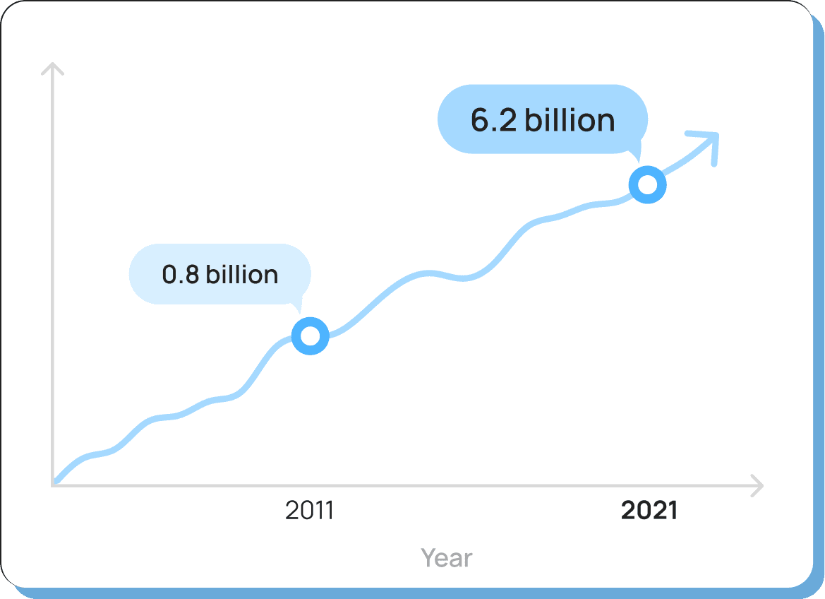 Smartphone users grew from 0.8 billion (2011) to 6.2 billion (2021).